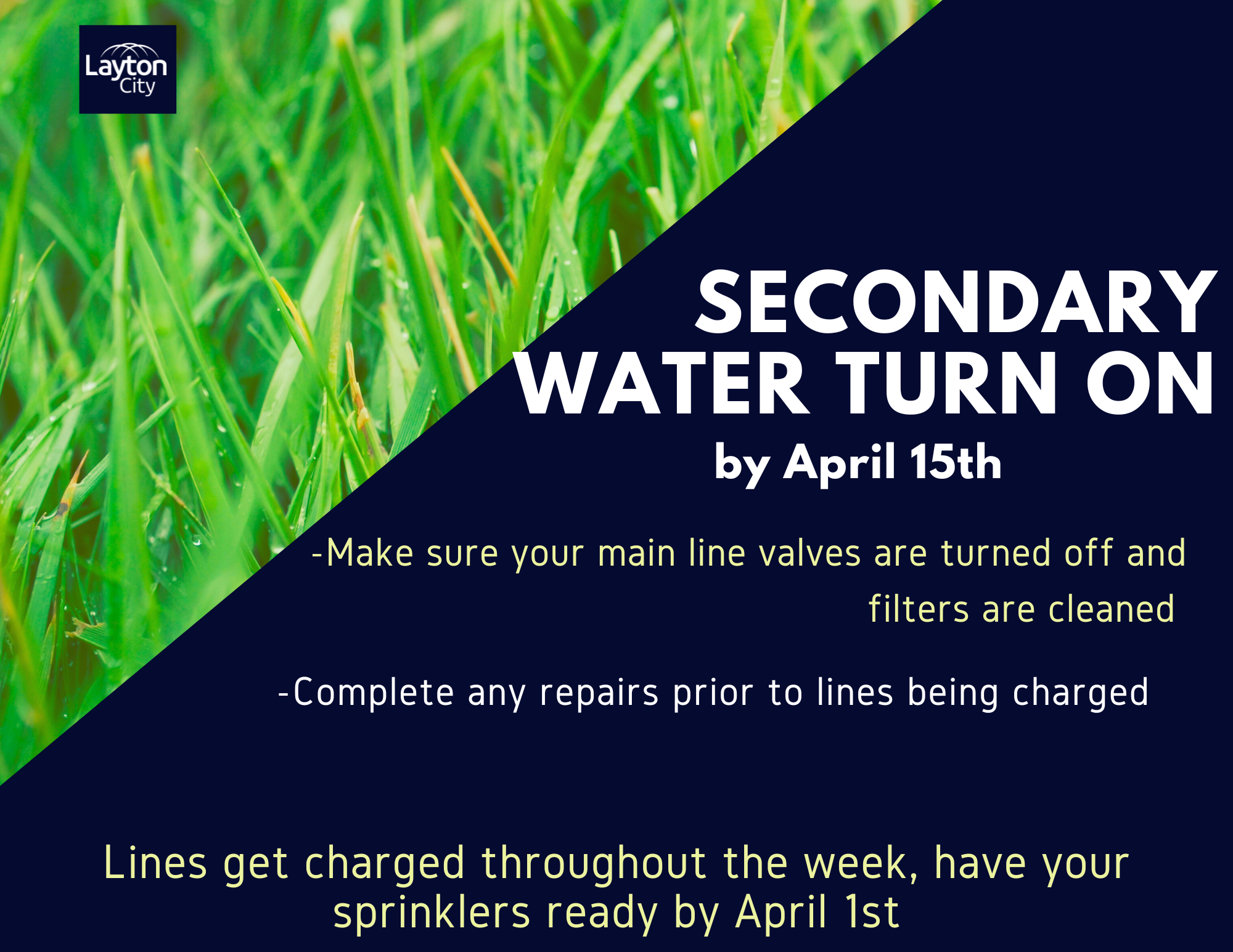 Secondary water service will be activated no later than April 15, 2025. To prevent potential issues, please make sure that main line valves are turned off, filters are cleaned, and any necessary repairs are completed by April 1.