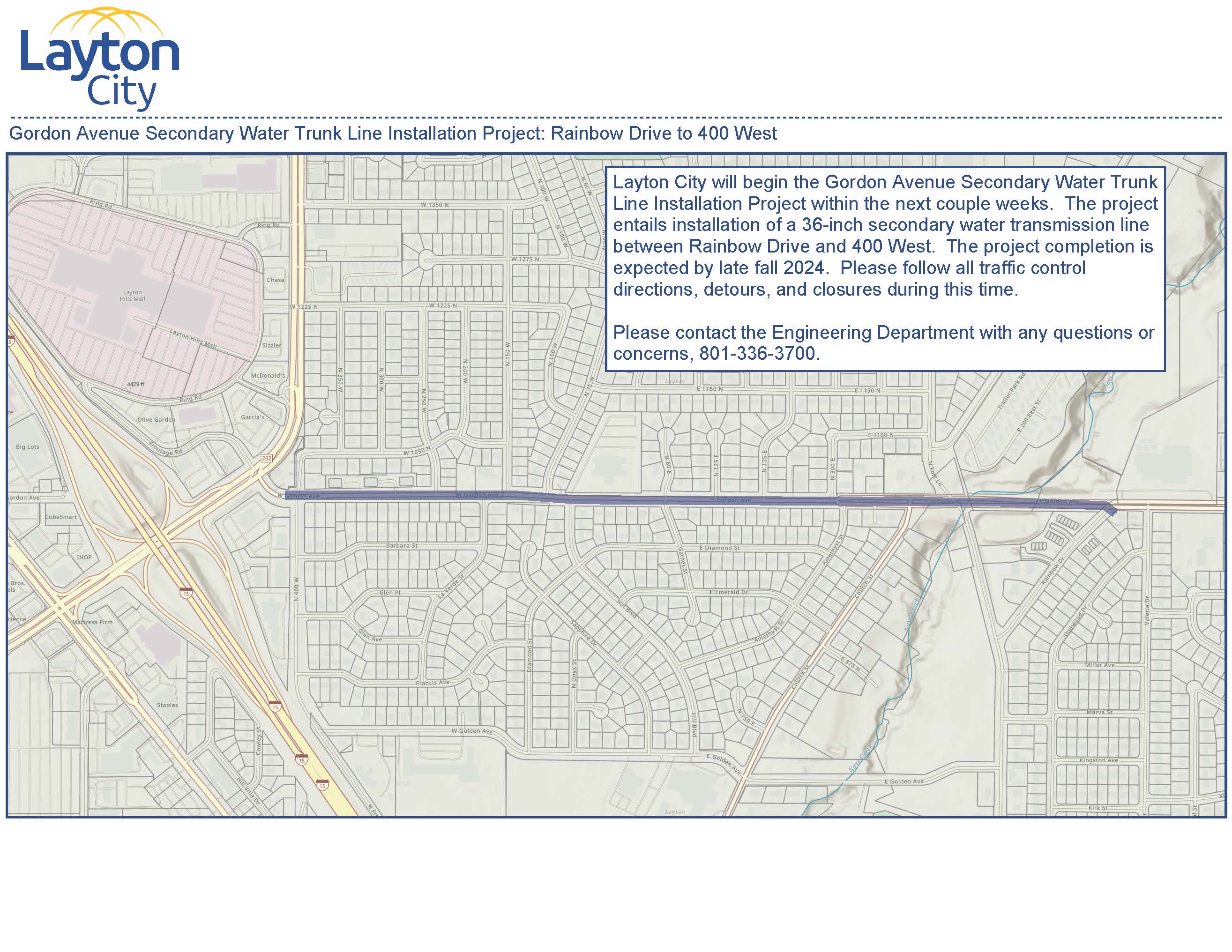 Layton City will begin the Gordon Avenue Secondary Water Trunk Line Installation Project within the next couple weeks. The project entails installation of a 36-inch secondary water transmission line between Rainbow Drive and 400 West. The project completion is expected by late fall 2024. Please follow all traffic control directions, detours, and closures during this time.