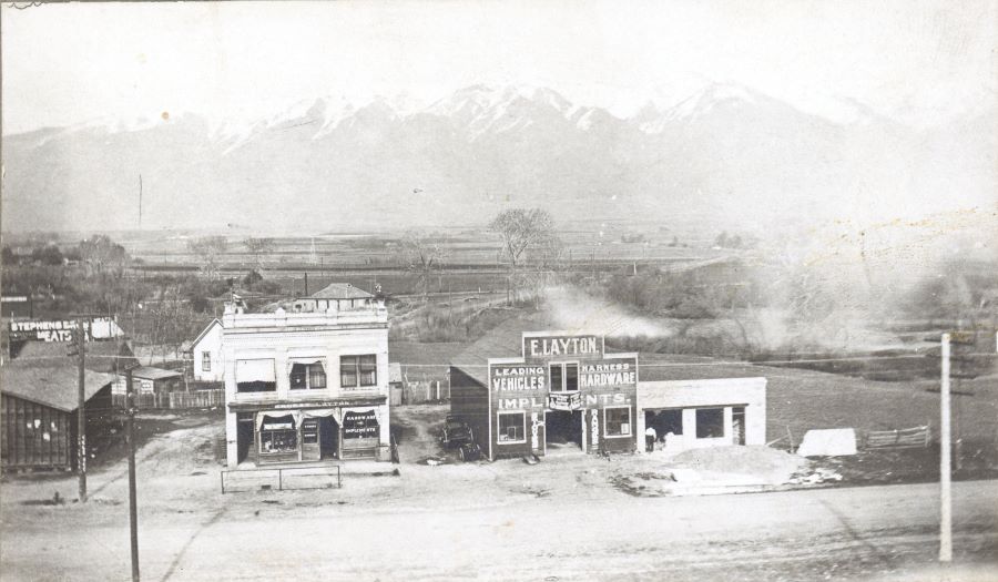Business along Layton’s Main Street was growing when Ernest Layton opened his hardware store in 1909, just south of where Main crossed Gentile Street. He located his two-story brick building to take advantage of the increasing activity generated by the Bamberger rail station, the Layton Roller Mill, the canning factory nearby on Cross Street, and increasing east-west traffic along Gentile. The Fa