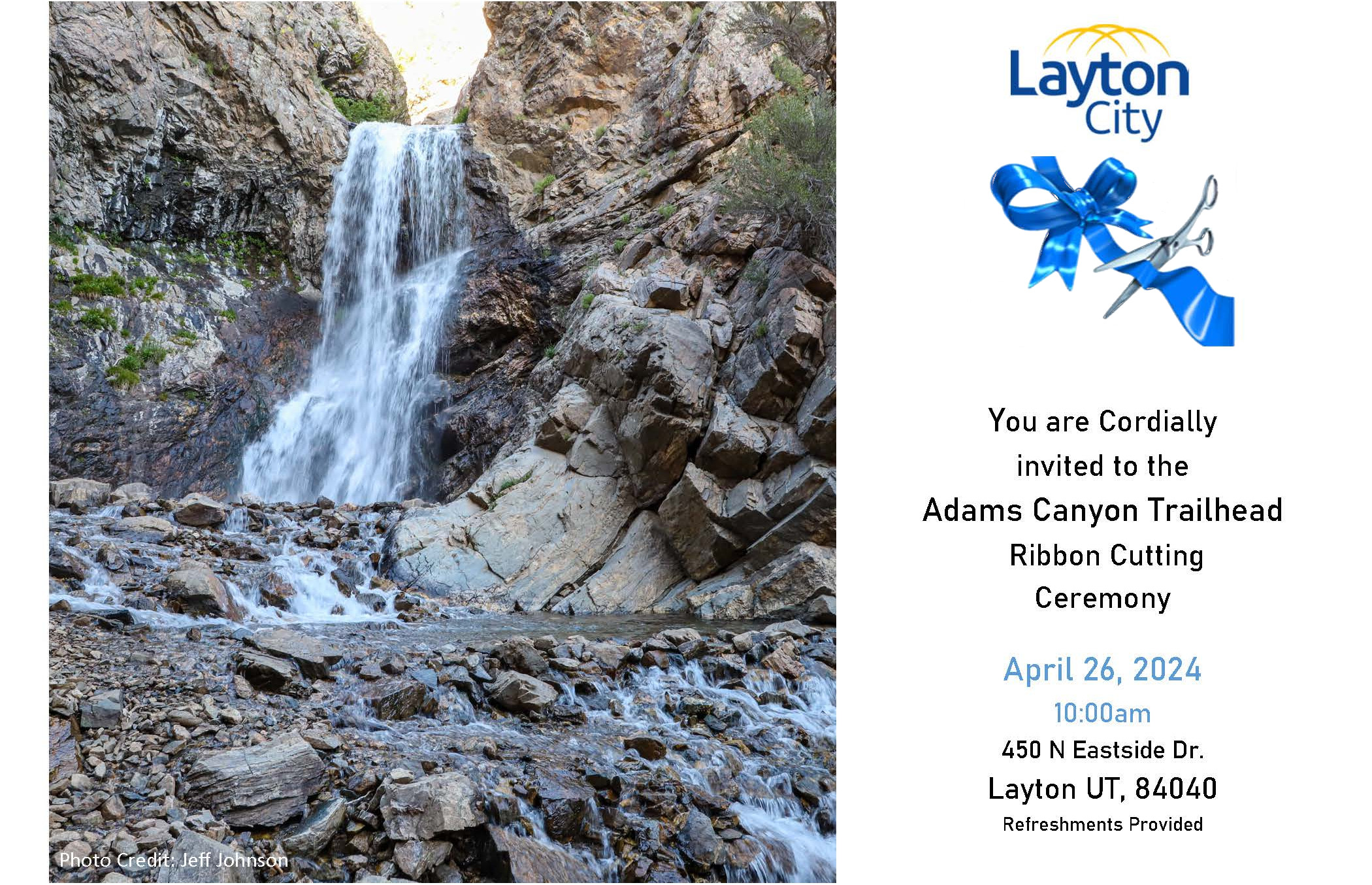 We wish to cordially invite you to attend the Adams Canyon Trailhead Ribbon Cutting Ceremony to be held on April 26th @ 10am. (Address 450 N. Eastside Drive, Layton, UT 84041)