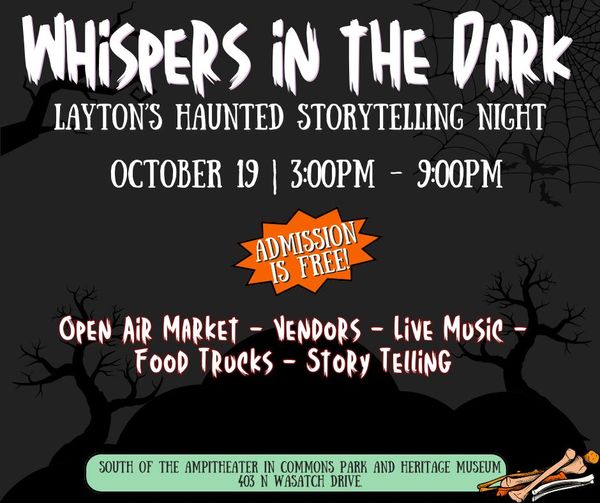 Join us October 19th from 3pm - 9pm for Whispers in the Dark, Layton's storytelling night. This event will have storytelling, a live performance of Active Pages by the Davis Arts Council, live entertainment, vendors, and food trucks.