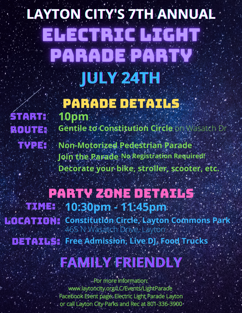 Come join in the fun and decorate yourself, bike, scooter, stroller, etc. for the 7th annual Electric Light Parade. The Party Zone will return again this year along with food trucks and music, so be sure to follow the parade to Layton Commons Park.