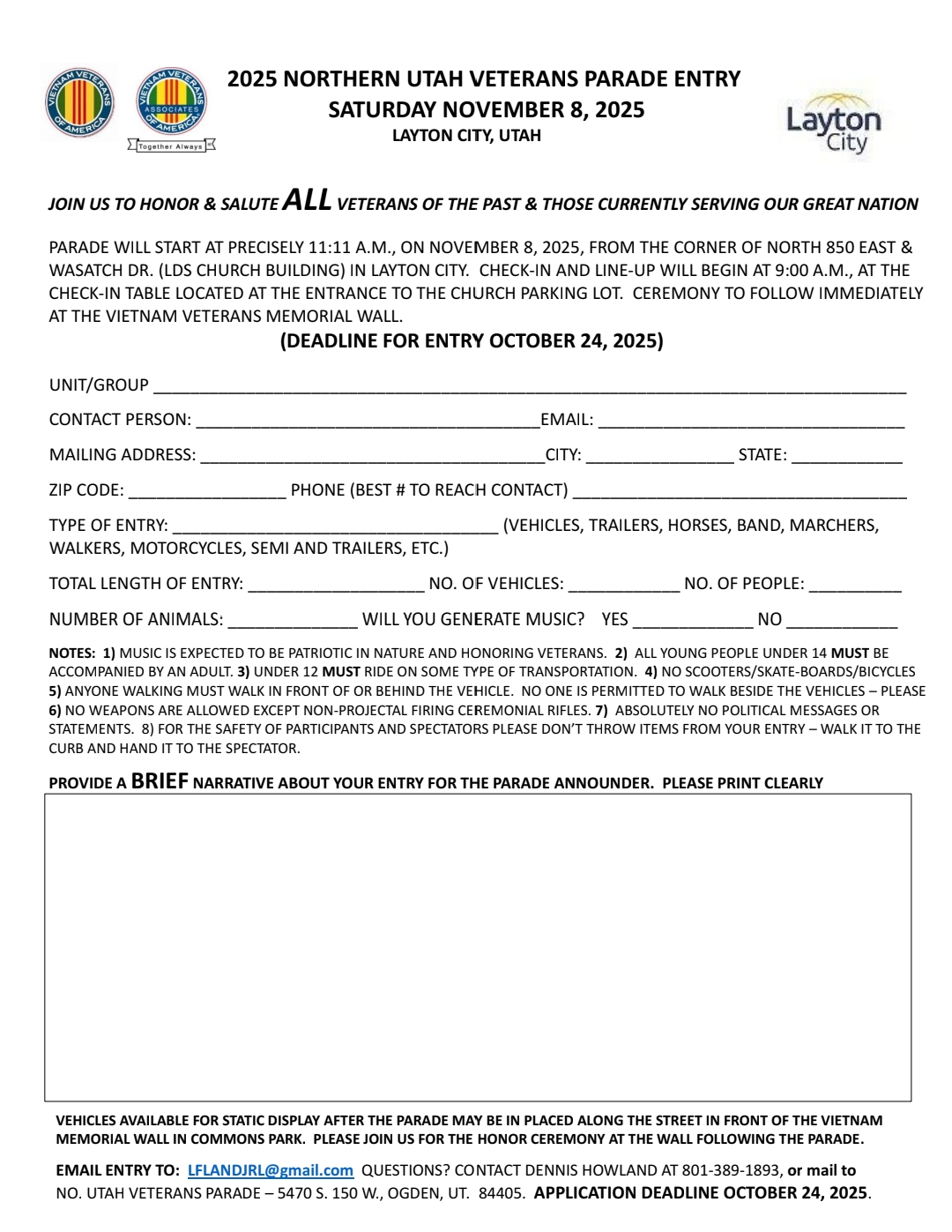 Layton City, the Northern Utah Vietnam Veterans of America (VVA), and the Fleet Reserve Association (FRA) will host the annual Veterans Parade on Saturday, November 8th, 2025. The Veterans Parade is an event to honor all men and women who have served and are currently serving in the Armed Forces. This year will mark the 19th year of the Veterans Parade and the 6th time it has been held in Layton City. The Veterans Parade, scheduled to start at 11:11am, will proceed along Wasatch Drive, through Layton Commons Park (Constitution Circle), and ending at the south end of Layton Commons Park, near Hawthorne Drive. All community organizations as well as veterans groups are invited to participate in the parade. Being a veteran group is not required to participate in the parade. Anyone that desires to say thank you to veterans is also welcome. No political statements or references will be allowed in the parade. Parade lineup is at 9:30am, in the parking lot at 789 Wasatch Drive. Additional parade information may be obtained by contacting Dennis Howland at 801-389-1893 or Lawrence at lflandjrl@gmail.com.