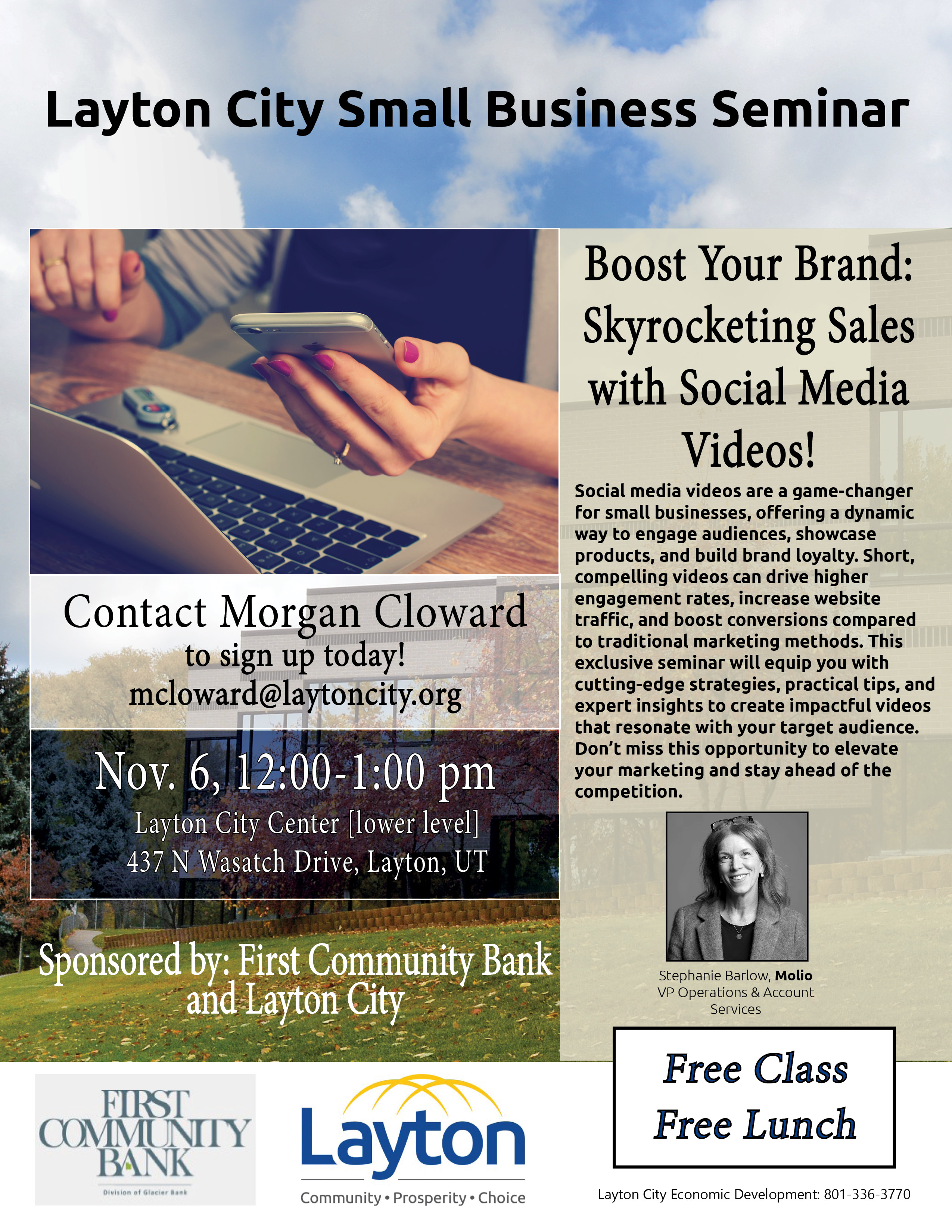 Layton City is excited to announce an exclusive Small Business Seminar designed to equip you with the skills you need! Featuring Stephanie Barlow, VP Operations & Account Services with advertising agency Molio. Molio has helped more than 30 brands, from startups to household names, including Ocean Spray, Costa Vida, and Purple, employ the “Molio Method” to achieve their growth goals.