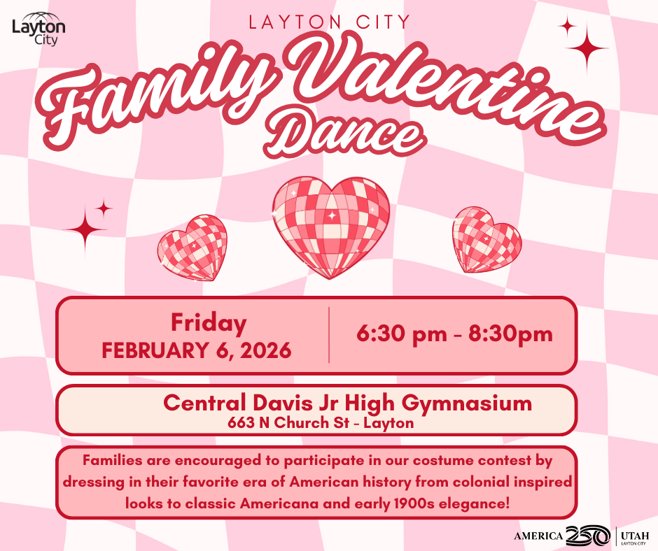 Step back in time and celebrate Valentine’s Day at Layton City’s Liberty Ball, a family-friendly evening inspired by America’s past and presented as part of America250 celebration with live music, dancing, dance lessons, refreshments, costume contest, and giveaways!