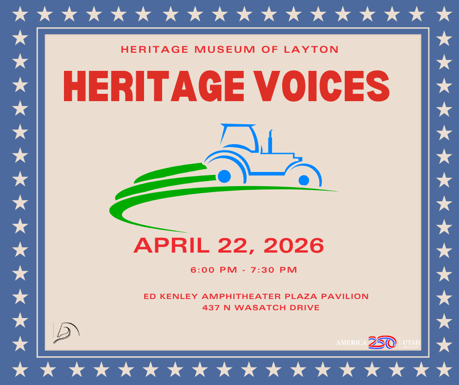 Heritage Voices: An Evening with Layton's Farming Community. Step into the living history of Layton and hear directly from the people who know it best. Come hear from a panel of local farmers as they share stories of their land, their livelihoods, and the traditions that shaped this community for generations. Bring your family branding iron to brand a piece of wood as we try to preserve an important piece of local history. 6:30-7:30pm at the Kenley Pavilion, just West of the Kenley Amphitheater in Layton Commons Park.